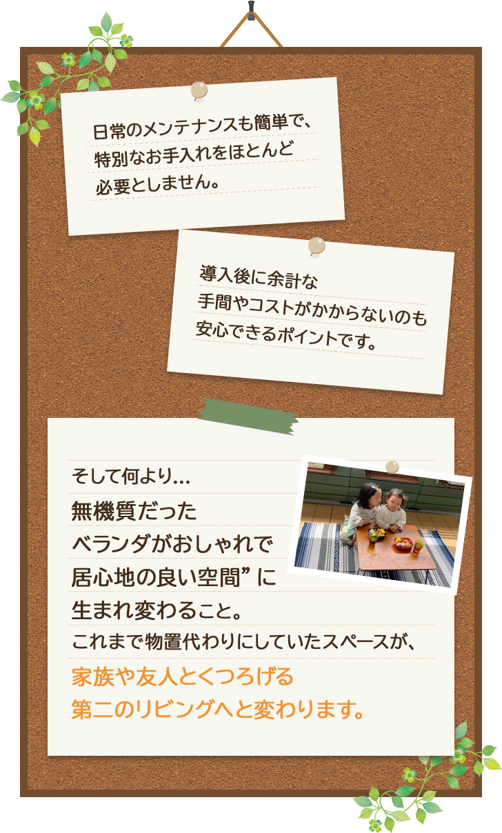 小さなウッドデッキは組立済みの状態ですので、どなたでも家具に近い感覚で設置・取り外しを行えます。大規模修繕時の取り外しにも便利ですし、工事による騒音もございません。