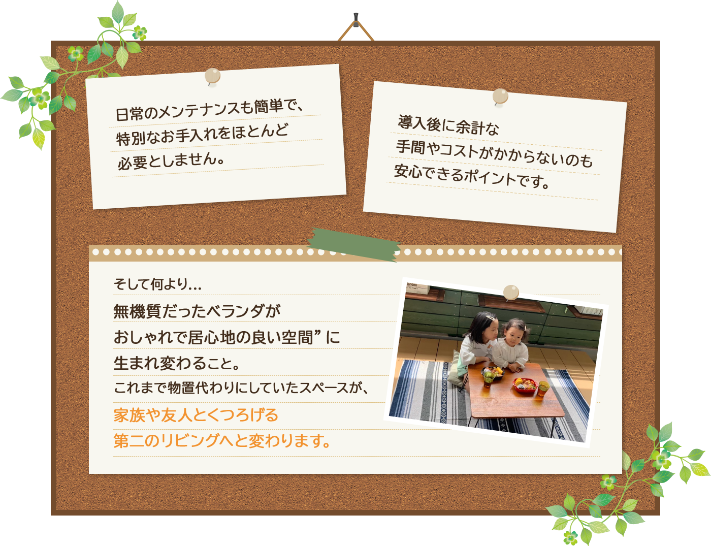 ベランダに本格ウッドデッキを置くことができたら…。そんなお客様の夢を実現させるために、ベランダガーデンは誕生しました。