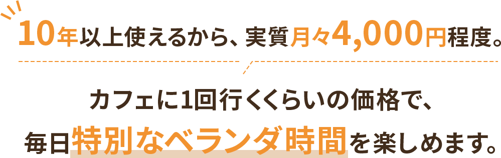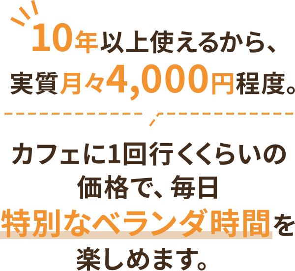 工事不要でユニット式の簡単設置ができるのも大きな魅力です。 DIY感覚で導入でき、マンションやアパートのベランダにも設置しやすい構造です。 大掛かりな工事をせずに、自宅で憧れのベランピングや アウトドアリビングを実現できます。
